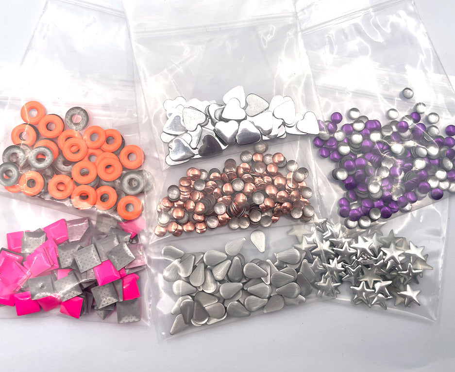 Learn More & CustomIt is made of raised aluminum semicircles, which have a smooth surface, metallic luster and a strong 3D look. Over 30 shape and color options, including pearl and neon color, to use in your designs and logos. This classic and easy-to-apply decoration method is the perfect choice for jeans and retro personalized clothing...