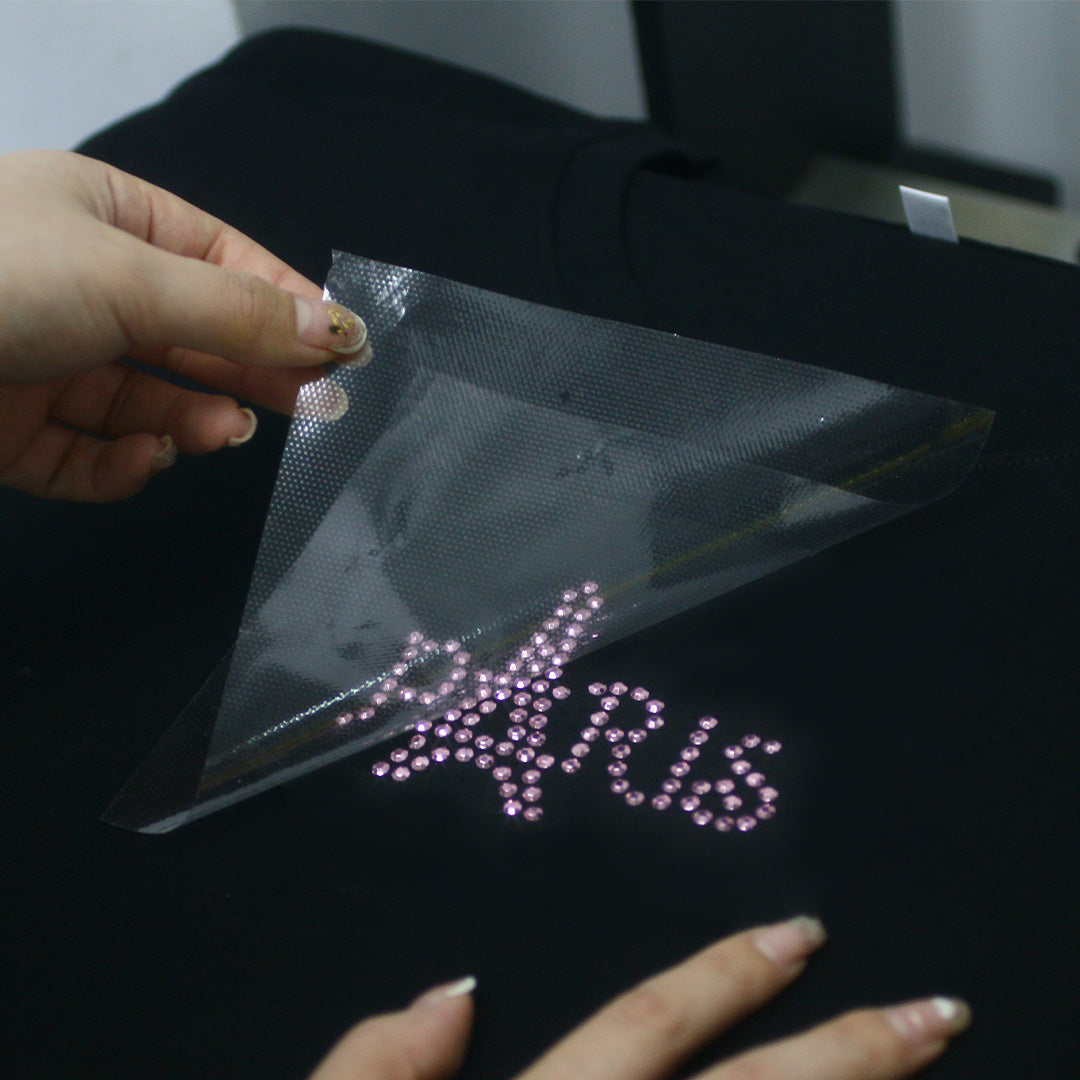 Use rhinestud transfer to quickly customize personalized patterns and logos for your T-shirts or hoodies. No matter the brand, IP clothing for amusement parks or promotional gift clothing, the value of your product will be doubled through high-end, eye-catching logos and sales opportunities will increase.