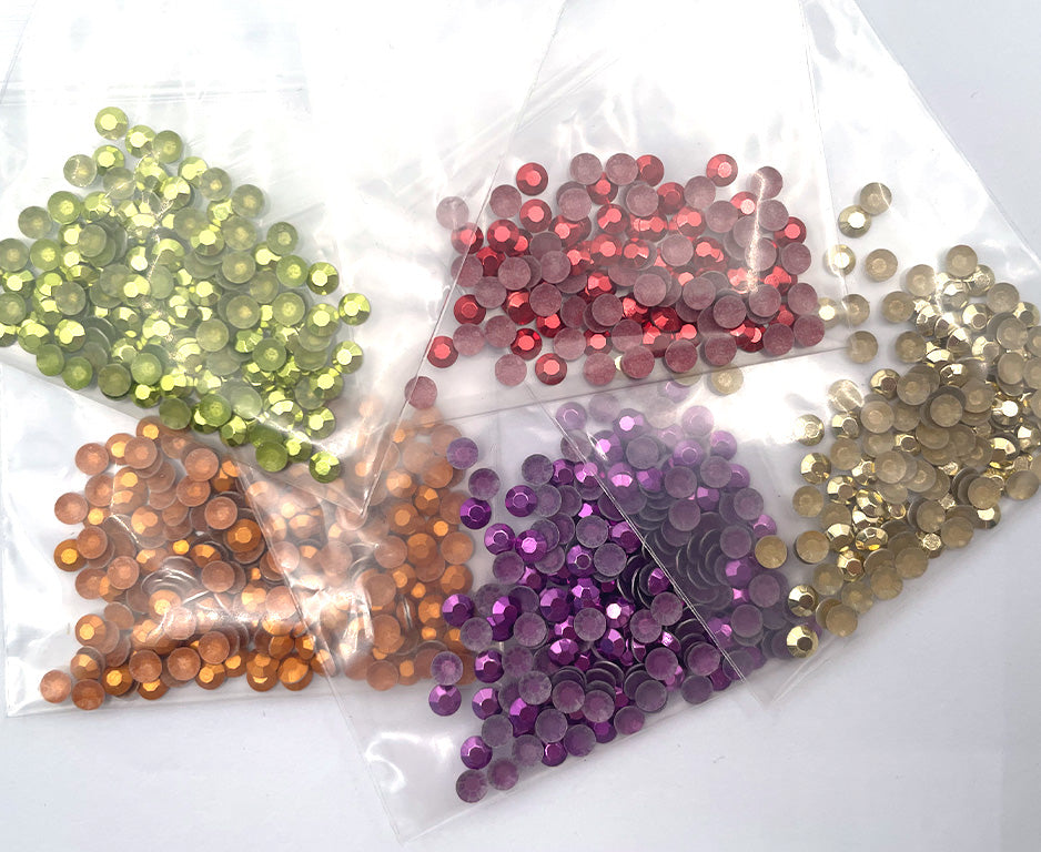 We provide high-quality aluminum rhinestuds that are certified as environmentally friendly by SGS and PONY. They have cut facets (Similar to the diamond-cut facets) and come in a variety of metallic colors. and provide you with designs based on your artwork or ideas, choosing the best materials to highlight your logo, design, name or numbers, then modling and crafting, finally transferring the pattern onto our premium hot fix transfer tape, and set everything up for your.