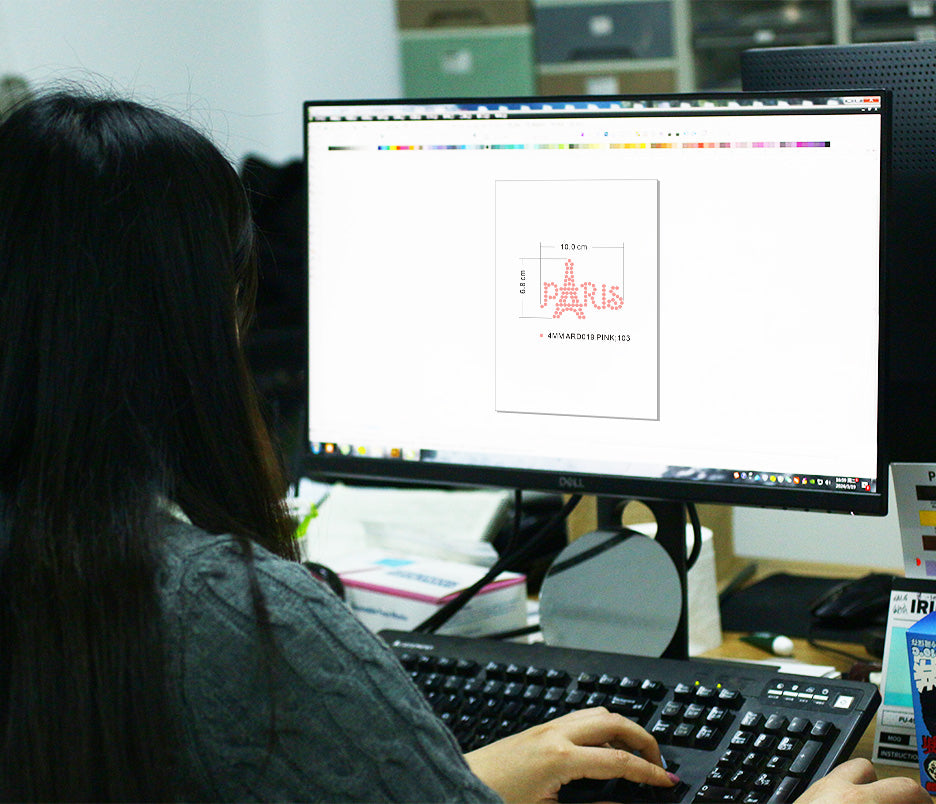 HYI rhinestud trasnfer use laser modeling technology to create templates with precise holes and shapes based on production files. The material is transferred to the template by a combination of hand and machine, and the pattern is then adhered to the carrier sheet through a layering operation. The design is then transferred to the fabric using a heat press or a home iron.
