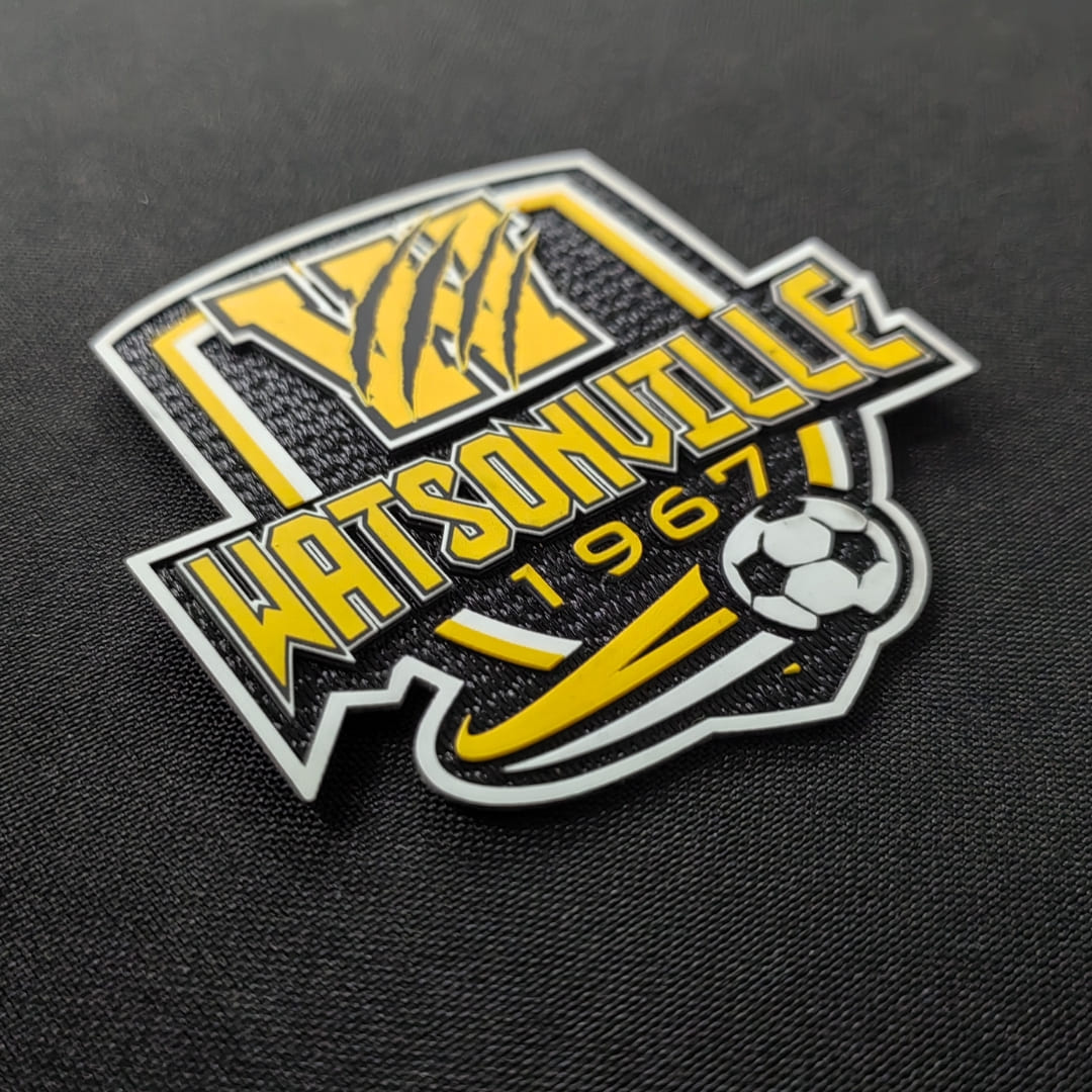Emossed silicone logo transfer with CMKY printing club logo, 1-7 colors, thickness 0.8/1mm/1.5mm, customizable matte, glossy, size and color, smooth and Satin-luster background, customizable size, colors and shape.