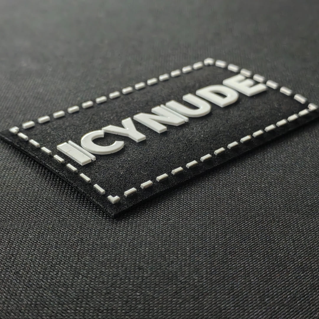 Screen printing silicone logo with Anti-migration layer, 1-7 colors, thickness 0.8/1mm/1.5mm, customizable matte, glossy, size and color, skin friendly velvet feeling microsuede background, customizable shape, size, color.